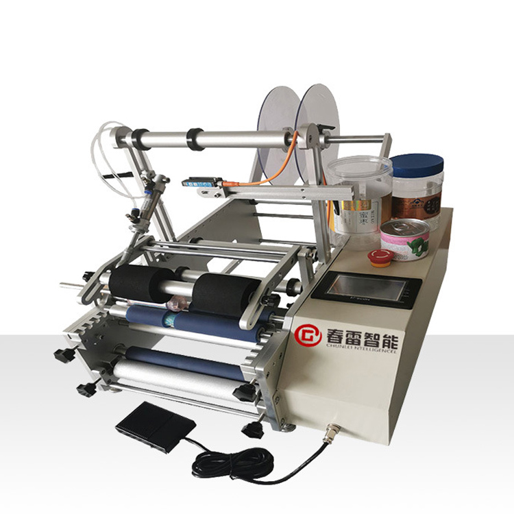 Pusiau automatinė apvalių butelių ženklinimo mašina (įskaitant ekraną) yra pusiau automatinė etikečių klijavimo mašina, tinkanti įvairių specifikacijų cilindriniams objektams ženklinti, mažų kūginių apvalių butelių ženklinimui, pvz., ksilitoliui, kosmetiniams apvaliems buteliams, vyno buteliams ir kt. spausdintuvas ir rašalinis spausdintuvas, ženklinant ir spausdinant gamybos partijos numerį ir kitą informaciją tuo pačiu metu, sumažina pakavimo procedūras ir pagerina gamybos efektyvumą.